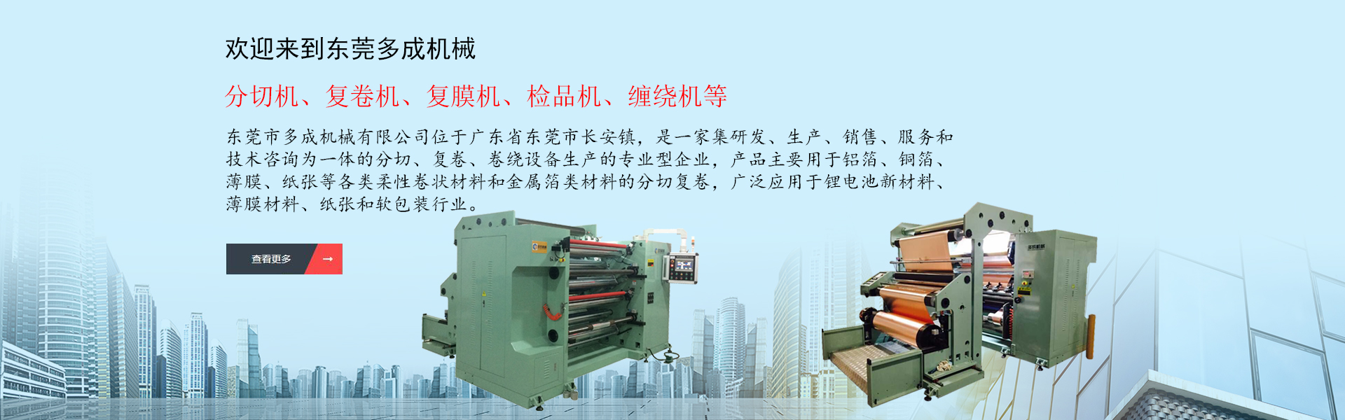 東莞市多成機械有限公司位于廣東省東莞市長安鎮(zhèn),是一家集研發(fā)、生產(chǎn)、銷售、服務和技術咨詢?yōu)橐惑w的分切、復卷、卷繞設備生產(chǎn)的專業(yè)型企業(yè),產(chǎn)品主要用于鋁箔、銅箔、薄膜、紙張等各類柔性卷狀材料和金屬箔類材料的分切復卷,廣泛應用于鋰電池新材料、薄膜材料、紙張和軟包裝行業(yè),產(chǎn)品范圍有分切機、復卷機、復膜機、檢品機、纏繞機等,是國內(nèi)外分切卷繞設備專業(yè)供應商。